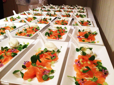Cut the cured salmon into small cubes and place in hole of the cucumber cup